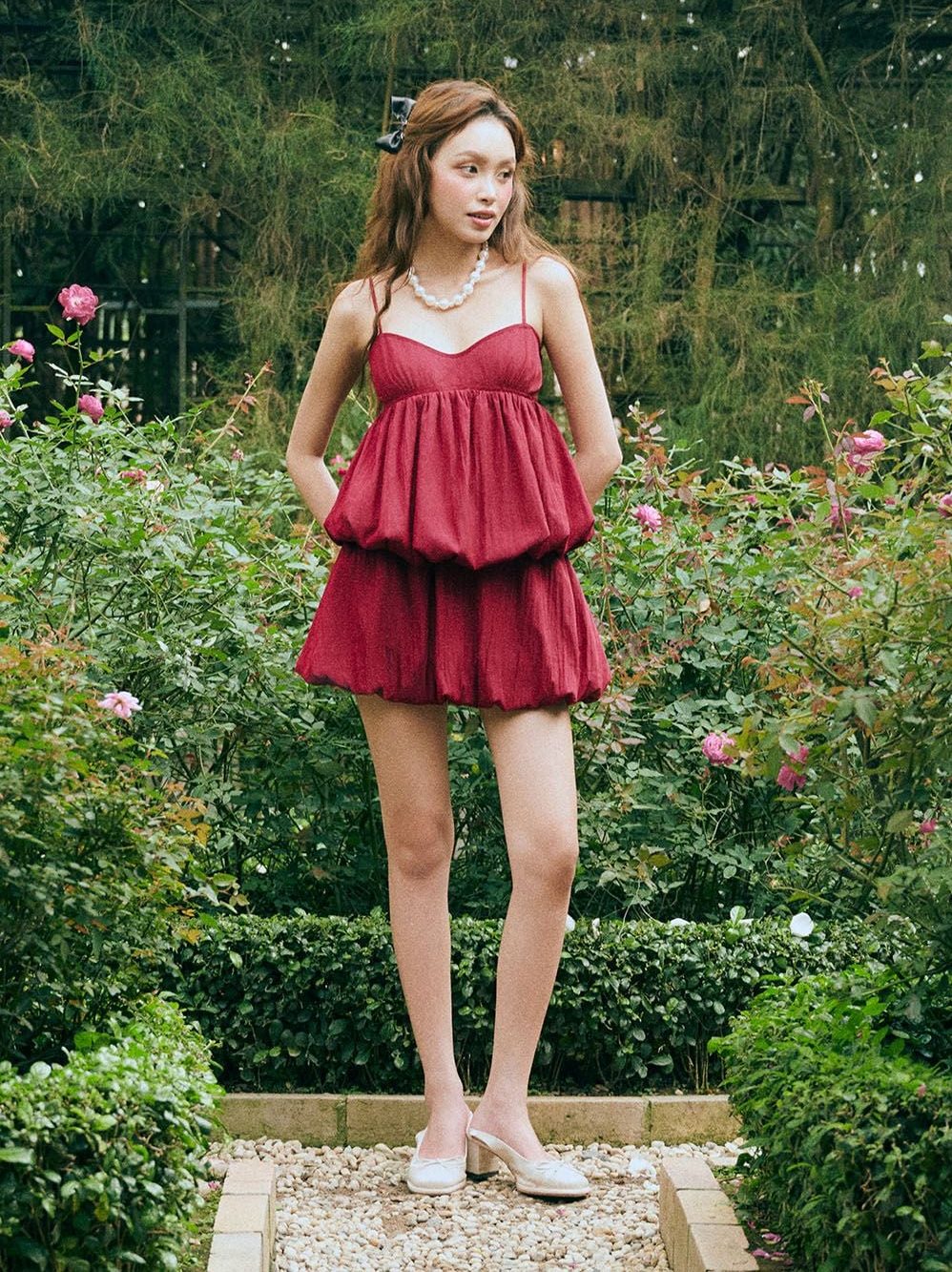 Chiếc chân váy có form dáng bồng nhẹ, giúp tạo cảm giác mềm mại khi di chuyển. Chi tiết rút nhún được bố trí tinh tế, giúp váy ôm nhẹ phần eo và tạo hiệu ứng tôn dáng. Kiểu dáng đơn giản nhưng vẫn rất thời trang.